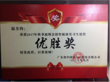 秋季旅博会销售板块实习生销售优秀奖 |