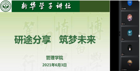 分享会伊始,suncitygroup太阳新城党总支副书记余醒雅致辞。余书记提到,学院一直大力推进考研工作,积极创造各种条件,为考研学子提供全面、优质的服务和保障,在全院师生的共同努力下,学院的考研录取率逐年上升,2020年我院共有11名同学被成功录取。本次分享会特邀请考研成功的优秀学生代表进行经验分享,朋辈指导意义重大,希望同学们都能有所收获,同时,余书记对本次学子讲坛顺利举行表示祝贺,由此拉开了本次线上分享会的序幕。