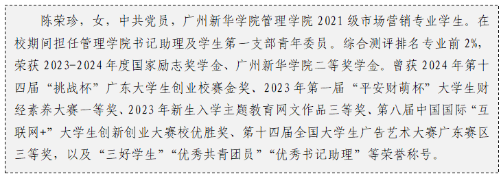 学习是学生的天职,陈荣珍同学始终秉持“不断进取,方能立于不败之地”的信念。她以严谨的态度对待每一门课程,以勤奋的精神投入每一次学习,在2023-2024学年荣获国家励志奖学金、学校二等奖学金和“三好学生”等称号。她深知学习的意义不仅在于成绩,更在于拓宽视野、提升自我。因此,她积极参与学术讲座、“挑战杯”大学生创业大赛、创新创业大赛及“三下乡”实践活动,与优秀学者交流,不断拓展知识面。在2023年第一届“平安财萌杯”大学生财经素养大赛中,她凭借《国内旅游业发展前景分析报告》荣获初赛一等奖以及复赛全国百强。该报告基于详实的数据分析,深入探讨后疫情时代国内旅游业的复苏路径与创新方向,提出以数字化营销、绿色旅游和区域联动为核心的三大发展策略,获得评委的一致好评。此外,她在第八届中国国际“互联网+”大学生创新创业大赛中荣获校赛优胜奖,展现她的创新能力和实践精神。