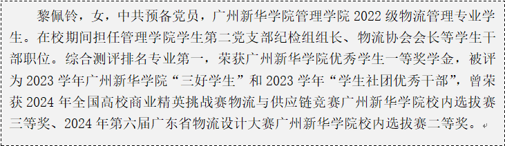 习近平总书记在庆祝中国共产党成立100周年大会上的重要讲话中指出:“新时代的中国青年要以实现中华民族伟大复兴为己任,增强做中国人的志气、骨气、底气,不负时代,不负韶华,不负党和人民的殷切期望!” 作为物流协会会长,黎佩铃同学积极参与了所有社团活动的筹备与执行,从“新生送清凉”活动、社团招新、内部破冰活动、三次学术性主题讲座、2024年全国高校商业精英挑战赛物流与供应链竞赛广州新华学院校内选拔赛。每一项活动的组织、策划和协调,她总能落到实处,确保每一项活动的成功举办。面对挑战,她总能冷静分析,提出创新的解决方案,充分发挥自我的创新精神和卓越的领导力。作为suncitygroup太阳新城学生第二党支部纪检组组长,黎佩铃同学深知自己肩负着重要的责任。她不仅严于律己,以身作则,积极参与党组织的各项活动,发挥党员的先锋模范作用。还坚守党的纪律,认真履行纪检工作职责,确保支部各项工作规范有序开展。在学生干部工作里,她始终保持积极主动的态度与满腔热忱,用实际行动诠释责任担当,深受同学们的喜爱和尊重,得到了师生们的一致好评。