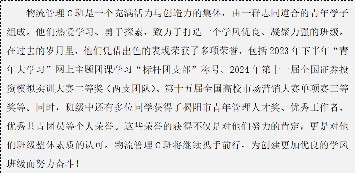 在综合素质方面,物流管理C班的学生同样不容小觑。他们积极参加各种社会实践活动,如“返家乡义教”活动、暑期三下乡社会活动等,为社会做出了积极的贡献。同时,班级中还有多位同学获得了揭阳市青年管理人才奖、优秀工作者、优秀共青团员等个人荣誉,这些荣誉的获得不仅是对他们个人能力的肯定,更是对班级整体素质的认可。