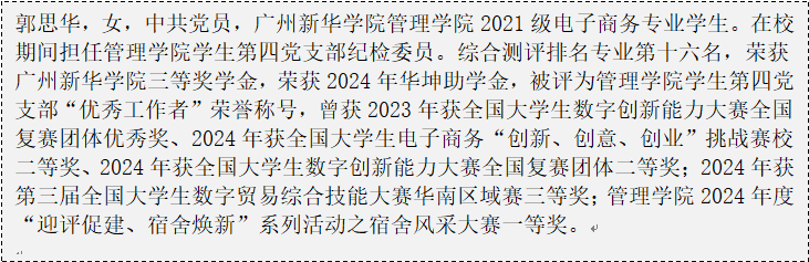 早在入学时,郭思华同学便立下脚踏实地、稳扎稳打的目标,于是她刻苦钻研、认真学习各专业知识。通过课堂学习和社会实践,不断提升自己的学术能力和实践能力,参加了各种学术竞赛和科研项目,积累了宝贵的经验和知识。