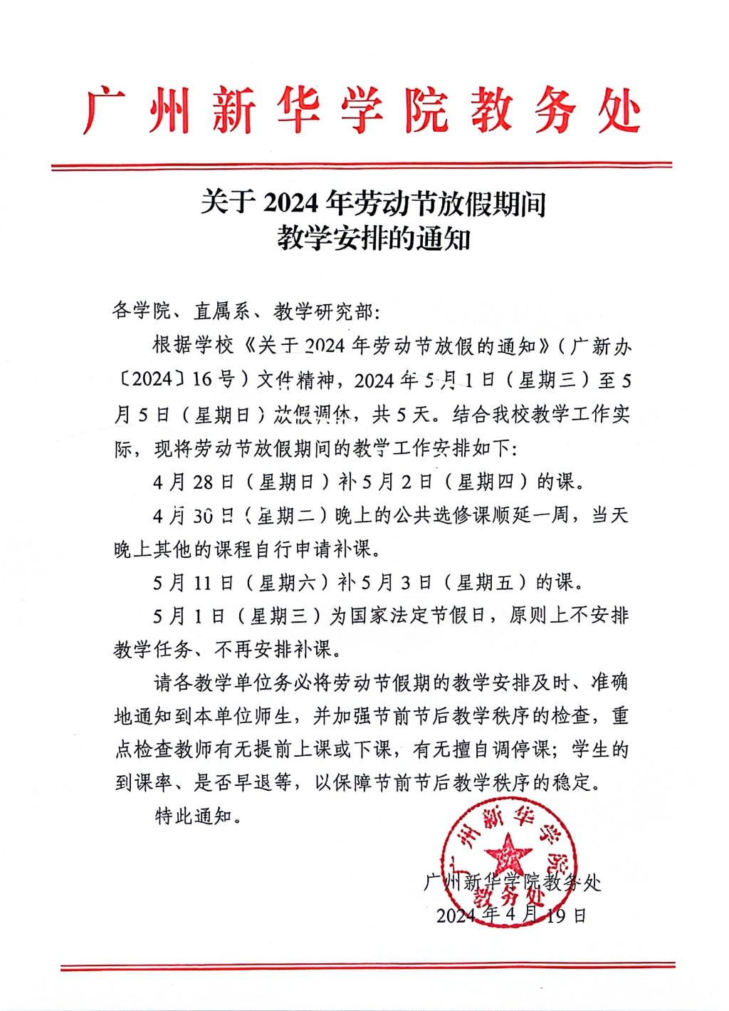 关于2024年劳动节放假期间教学安排通知