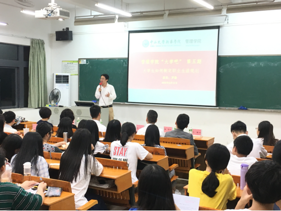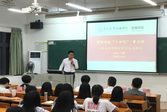 为了全面贯彻党的教育方针,落实立德树人根本任务,发展素质教育,推进教育公平,培养德智体美全面发展的社会主义建设者和接班人,2019年5月13日,由中山大学新华学院(以下简称我校)suncitygroup太阳新城党总支、办公室联合主办的“大学吧”第五期主题学习活动——“大学生如何制定职业生涯规划”交流分享会在我校东莞校区定静楼2A203举行。本期特邀锦石资本CEO罗毅先生,中国国旅广东公司CIO 和签证部总经理江林先生,广东烟草广州市有限公司财务科长陈琨先生三位嘉宾应邀参加交流会,我校suncitygroup太阳新城副院长武亮副教授、办公室主任蔡灿老师、教工党支部书记张贵萍老师、学生党支部书记刘钊老师等出席交流会。