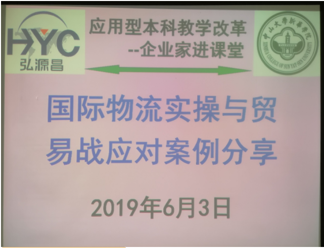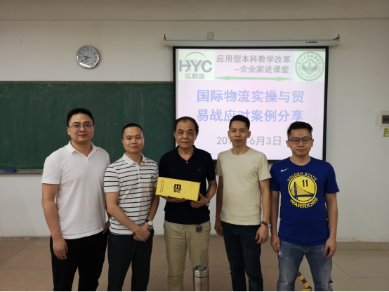为了让我院17级物流管理专业的同学们能更好地学习《国际物流》课程,更好地帮助同学们理论联系实际,该课程任课老师方轮教授邀请弘源昌国际货运代理有限公司(以下简称“弘源昌”)的詹国磷总经理一行四人于2019年6月3日晚在中山大学新华学院东莞校区定静2C302举行了一场“国际物流实操与贸易战应对案例”分享会。本次特邀企业高管走进课堂,也是对应用型本科教学改革的一次尝试。