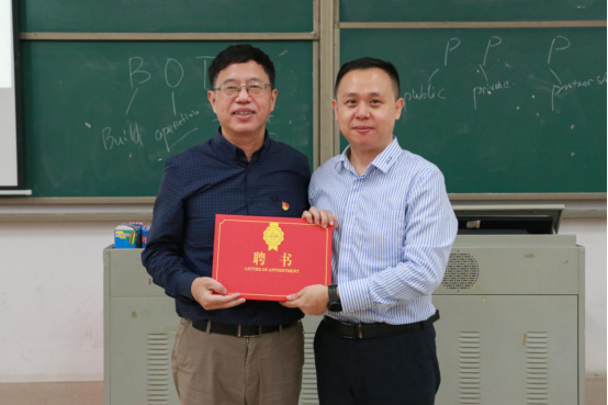 广东省项目管理学会秘书长柯建杰(右)为我校suncitygroup太阳新城执行院长彭建平教授(左)颁发聘书