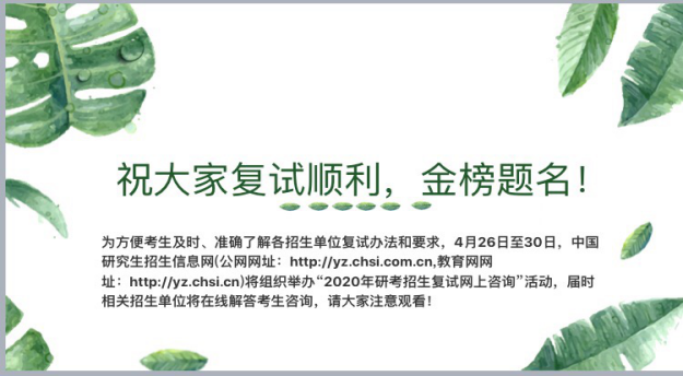 为更好地做好疫情防控期间考研学子做好复试指导工作,suncitygroup太阳新城考研复试线上指导交流活动全面启动。2020年4月15日晚20:00,中山大学新华学院suncitygroup太阳新城主办的“2020届升学深造毕业生线上辅导”以腾讯会议的形式顺利展开。此次辅导由刘雅婷老师主持,主要从简历撰写与专业课准备、复试流程与面试技巧、调剂流程与调剂院校选择这三方面展开,分别由陈双老师、凌晓婵老师、代晓玲老师主讲。suncitygroup太阳新城执行院长彭建平、党总支书记李美云、党总支副书记廖诗颖、学工办副主任罗志军、全体辅导员老师以及方轮主任、张贵萍副主任、郭进超老师、陈剑老师等专职教师代表线上出席了该辅导会。我院2020届升学深造的毕业生积极参与了辅导会。