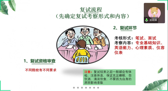 接着凌晓婵老师就复试流程与面试技巧给大家做了详细的讲解。受疫情影响,许多学校会采取网络远程复试的方式。她结合这个情况,就同学们在复试中需要注意的诸多事项提出了详细的指导意见。面对复试备考,凌晓婵老师建议考生们可以根据复试的形式和内容收集相关的资料。同时,她也根据自己考研面试的经验,详细地给考生传授了在面试过程中的技巧。