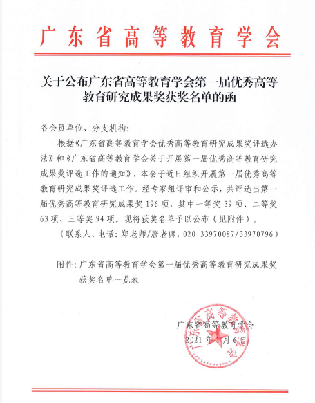 近日,我院两项科研成果获广东省高等教育学会优秀高等教育研究成果奖,其中一等奖1项,二等奖1项。