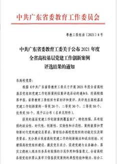 经我校推荐申报,省委教育工委组织专家初评和复评,2021年6月10日,中共广东省委教育工委公布了2021年度全省高校基层党建工作创新案例评选结果,我校共有2个基层党建工作创新案例脱颖而出,其中我院学生第一党支部的《依托学生社区文化项目,创新育人新平台》荣获2021年度全省高校基层党建工作创新案例优秀奖。