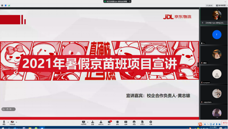 7月4日晚上,2018级电子商务和物流管理专业京苗班暑期实习宣讲会成功举行。受疫情影响,本次宣讲会在腾讯会议线上宣讲,京东京苗班负责人黄志雄经理主讲,并与学生互动问答。我院物流管理专业主任方轮教授、电子商务专业副主任李晶副教授和90多位电子商务和物流管理学生参与了宣讲会。通过本次宣讲会,同学们的焦虑情绪得到了安抚,增强了战胜疫情、夺回损失的信心。