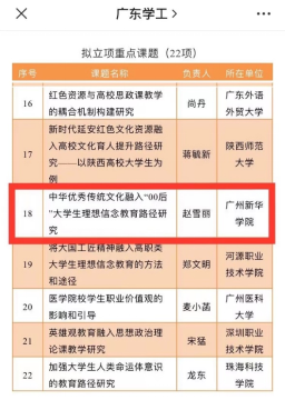 2022年1月21日,高校思想政治工作队伍培训研修中心(华南师范大学)、教育部高校辅导员培训和研修基地(华南师范大学)、广东省高等学校思想政治教育研究会公布了2022年度开放课题立项名单,我院辅导员赵雪丽老师主持的课题《中华优秀传统文化融入“00后”大学生理想信念教育路径研究》获批重点课题立项。