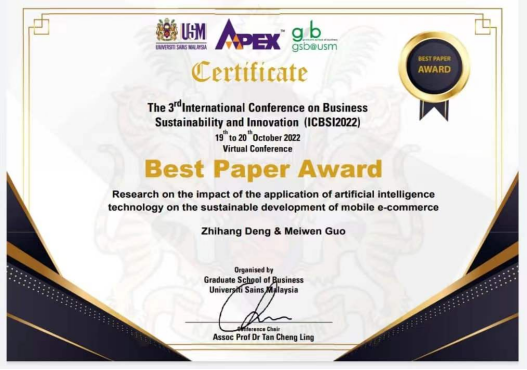 10月19日-20日,由马来西亚理科大学(全球QS 142名,泰晤士全球最具影响力大学2022排名第四)商学院主办、suncitygroup太阳新城为协办方之一的ICBSI 2022国际会议在线上进行,75篇入选论文的作者通过线上进行全英文的研究分享。经审稿专家投票甄选,我院2018级电子商务专业邓志航同学与郭美文老师合作撰写的论文获得国际会议最佳论文奖!