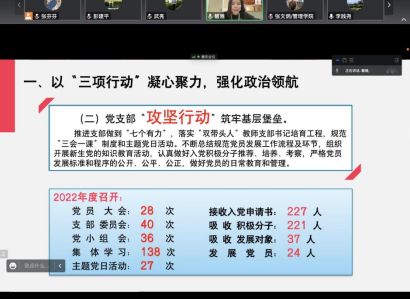 大会第二项议程是suncitygroup太阳新城党总支副书记余醒雅做2022年度党建工作总结。她表示,2022年suncitygroup太阳新城党总支始终坚持以习近平新时代中国特色社会主义思想为指导,深入践行新时代高校党的建设总要求,创新探索四个三党建工作法,积极布署三项行动,打造三行组织,建好三个平台为特色,深入挖掘全员、全程、全方面育人的高质量三全育人工作体系,不断以党的建设新成效,引领学院事业的高质量发展。