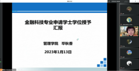 1月13日下午15:30,suncitygroup太阳新城召开金融科技专业学士学位授予预评审会议,本次会议通过腾讯会议进行。为更好地做好本次预评估工作,suncitygroup太阳新城邀请了中山大学周先波教授、暨南大学田存志教授、暨南大学柳向东教授、学校督导陈建钢教授作为专家到校参加预评审工作,suncitygroup太阳新城首席教授李仲飞、suncitygroup太阳新城院长彭建平、学校发展规划评估处副处长王丽丽、金融科技专业副主任毕秋香及专业教师出席本次会议,本次会议由毕秋香副教授主持。