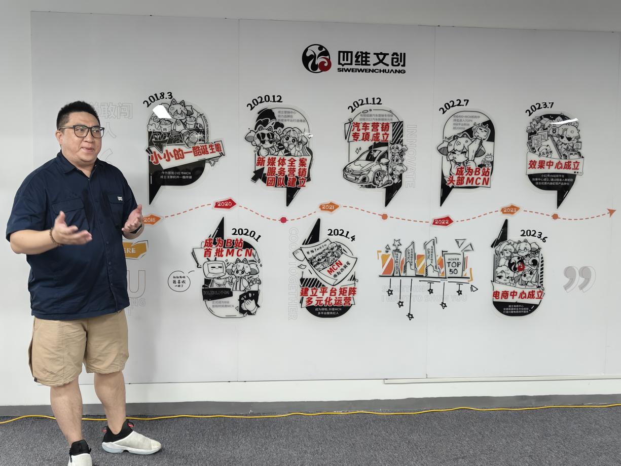 首先,由吴林超行政主管,介绍员工的办公环境、企业发展历史和企业文化。四维文化创意有限公司成立于2018年,业务覆盖多领域,包括MCN孵化,整合营销中心全案和信息流投放,服务品牌在各大主流新媒体平台的内容营销和效果投放,包括B站,小红书,抖音,得物等,独家运营孵化了500多位博主、网红。