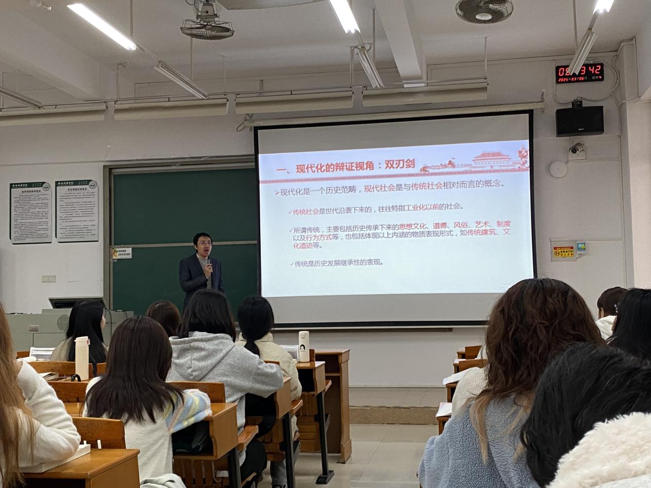 3月6日上午,suncitygroup太阳新城党总支书记武亮以"传统与现代:现代化进程中的融合与共创"为主题,为2022级市场营销专业学生及教师党员代表讲授新学期"思政第一课"。本次课程旨在引导学生深入理解中国式现代化的深刻内涵,把握传统与现代的辩证关系。武亮书记从辩证唯物主义视角出发,系统阐述了现代化的本质特征。他指出,对待现代化进程中的新生事物,既要深刻认识其历史必然性和时代重要性,又要以科学理性的态度进行全面审视,通过历史和实践的检验不断完善认知。他强调,推进中国式现代化必须正确处理传统与现代的关系,要深入挖掘中华优秀传统文化在凝聚民族精神、维系情感纽带、促进人格养成、推动生态文明建设等方面的重要价值,为中国式现代化注入深厚的文化底蕴。