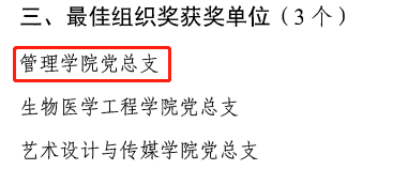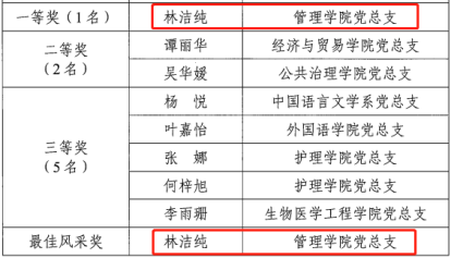 经过激烈角逐,最终我院师生党员在此次大赛中获得优异成绩。在教工组比赛中,我院教师党员、辅导员赵雪丽老师和李丽容老师分别荣获“二等奖”、“三等奖”;在学生组比赛中,我院19级工商管理专业学生党员林洁纯同学荣获“一等奖”及“最佳风采奖”;我院党总支荣获“最佳组织奖”荣誉称号。