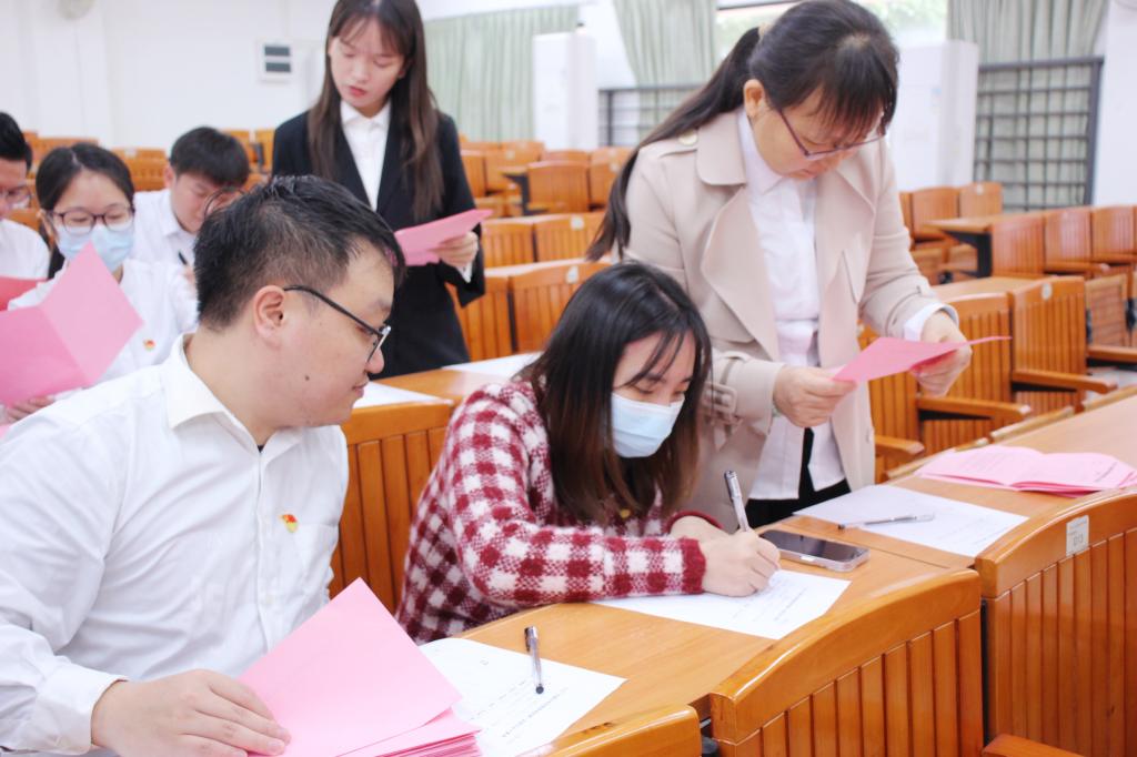 按照大会议程,全体党员同志依次对大会选举办法和总监票人、监票人、计票人名单进行表决,结果均为全票通过。余醒雅同志强调了本次换届选举以无记名投票方式进行,实行差额选举。大会严格按照公平、公正、公开的原则,经过查验票箱、发放选票、宣读填写规则后,党员们认真填写选票、有序投票。投票结束后,监票人、计票人回收、清点、计算选票。
