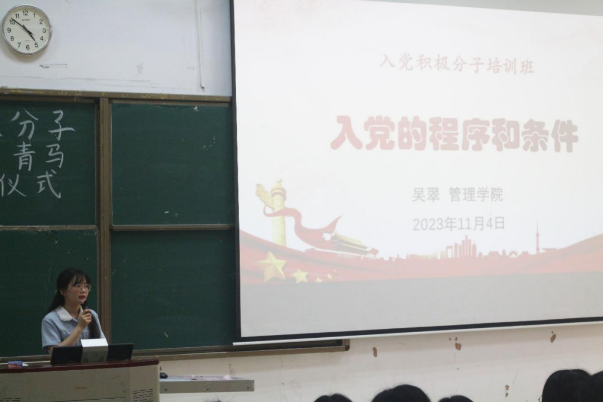 11月4日,入党积极分子培训班在定静②D203开班,党校教师蔡月明老师、邓钥琼老师、吴翠老师分别进行《党的性质、指导思想和宗旨》、《党的光辉历程》、《入党的程序和条件》专题党课辅导。本期集中理论学习内容充实,让学员进一步筑牢信仰之基、补足精神之钙。